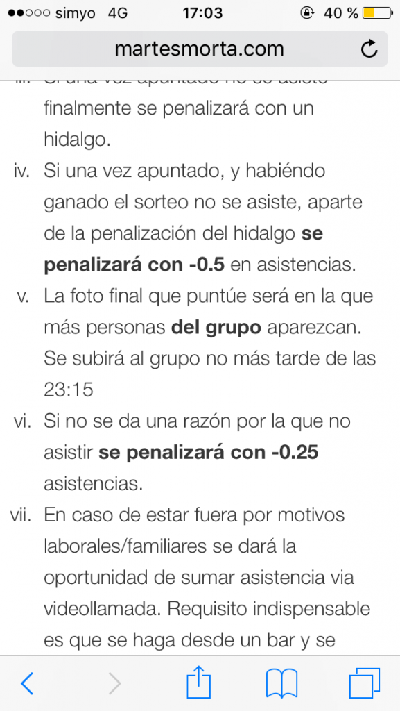 Me dirijo a usted con referencia al décimo martesmorta celebrado el 05/03/2019. Incumpliéndose la norma V del real decreto, habiendo subido la foto más tarde de las 23:15, en concreto a las 23:16, reclamo la anulación de los puntos acumulados de las personas que allí aparecen. Pruebas adjuntas.